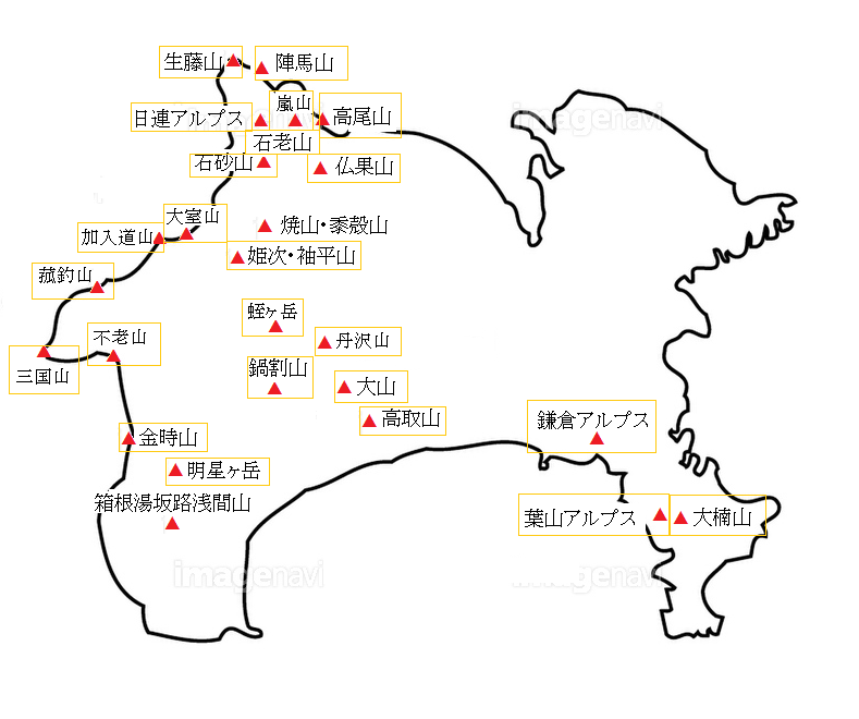 ※地域をクリックしてください 全図・北海道・東北・関東・栃木県・群馬県・埼玉県・東京 ・神奈川県 ・静岡県・山梨県・長野県・新潟県・中部・西日本(九州) 山名にポインターを当ててポインターの形状が変わったらクリック