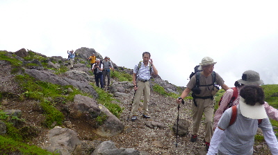 那須岳をバックに記念写真・・ここから、南月山までの縦走路はのんびり歩けます。