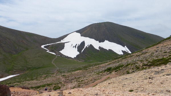 旭岳への登山道がはっきり見えてきました。あの雪渓を登ります。