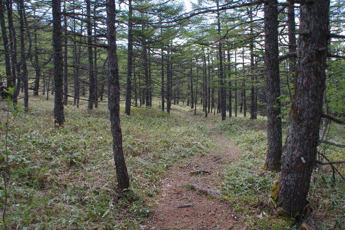 地蔵峠まで下ります。唐松の林のすてきな遊歩道でした。
