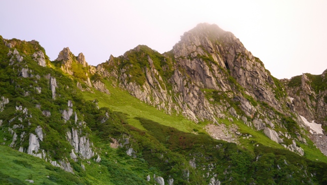 宝剣岳が朝日に照らされています。2002年の春に来たときは、山頂に登ったのですが、今回は最初からパス